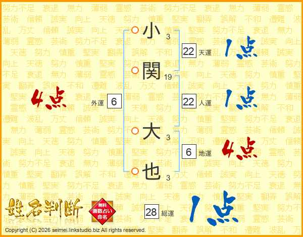 生活面を象徴する運勢です。外部から受ける影響力を表し、結婚運、家庭運や職場、環境への順応性を表します。総運から人運を引いた画数。姓や名が1文字の場合を除く。