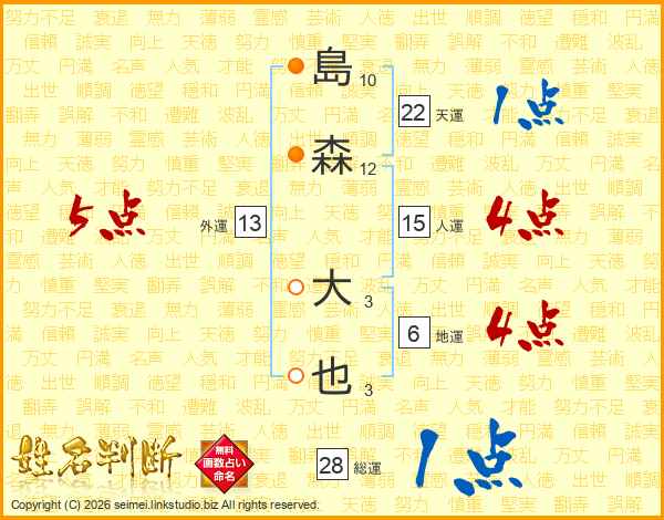 あなたの人生を表す1番重要な運勢です。生涯を通じて影響する総合運となり、主に50歳以降の晩年期に影響を及ぼします。苗字と名前の合計画数。