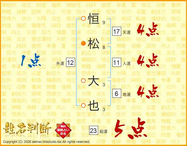 生活面を象徴する運勢です。外部から受ける影響力を表し、結婚運、家庭運や職場、環境への順応性を表します。総運から人運を引いた画数。姓や名が1文字の場合を除く。