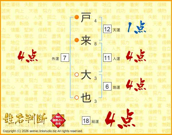 あなたの人生を表す1番重要な運勢です。生涯を通じて影響する総合運となり、主に50歳以降の晩年期に影響を及ぼします。苗字と名前の合計画数。