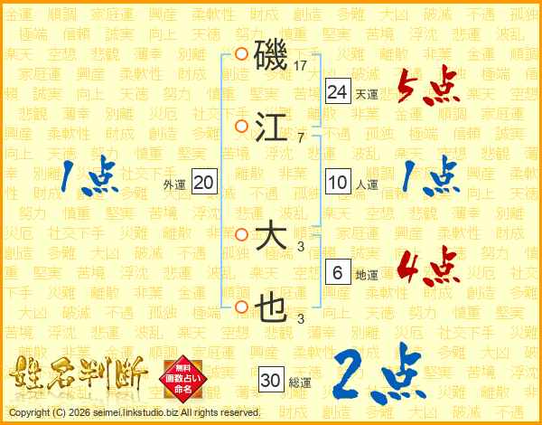 生活面を象徴する運勢です。外部から受ける影響力を表し、結婚運、家庭運や職場、環境への順応性を表します。総運から人運を引いた画数。姓や名が1文字の場合を除く。