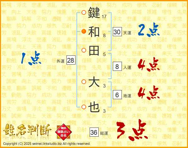 鍵(17画)和(8画)田(5画) 大(3画)也(3画)