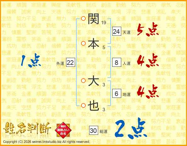 あなたの人生を表す1番重要な運勢です。生涯を通じて影響する総合運となり、主に50歳以降の晩年期に影響を及ぼします。苗字と名前の合計画数。