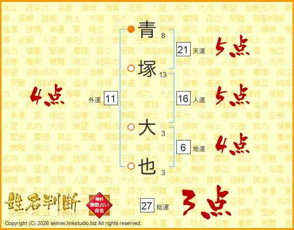 青(8画)塚(13画) 大(3画)也(3画)