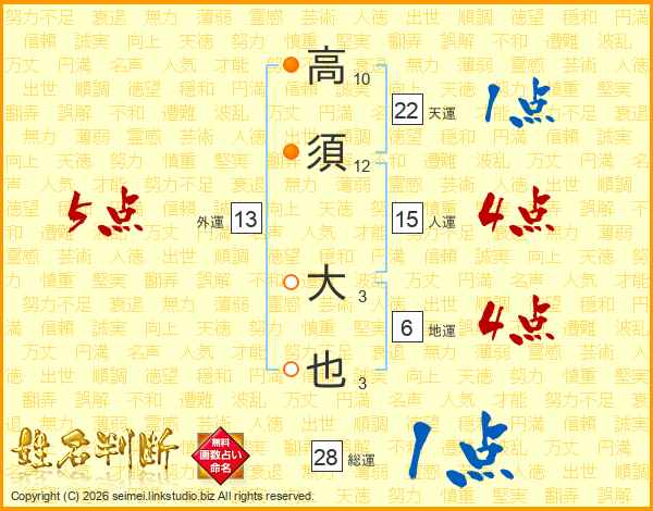 あなたの人生を表す1番重要な運勢です。生涯を通じて影響する総合運となり、主に50歳以降の晩年期に影響を及ぼします。苗字と名前の合計画数。