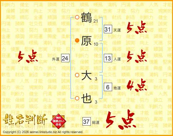 鶴原大也さんの総運は37画の5点!