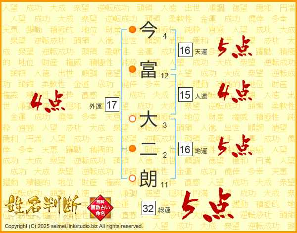 今(4画)富(12画) 大(3画)二(2画)朗(11画)