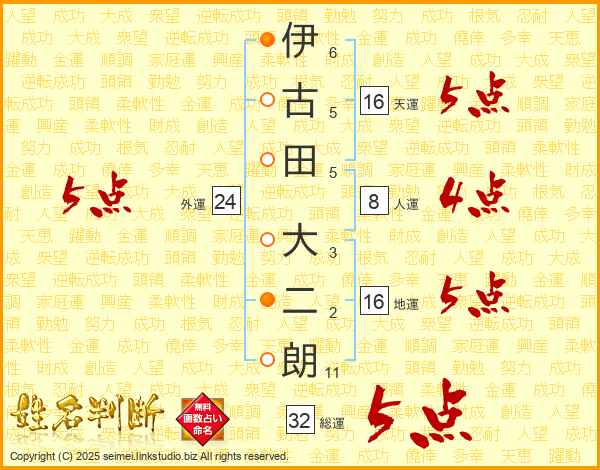 伊(6画)古(5画)田(5画) 大(3画)二(2画)朗(11画)