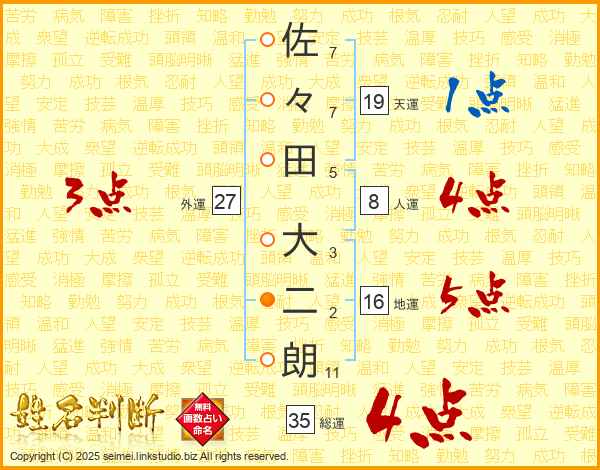 佐(7画)々(7画)田(5画) 大(3画)二(2画)朗(11画)