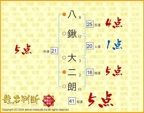 あなたの人生を表す1番重要な運勢です。生涯を通じて影響する総合運となり、主に50歳以降の晩年期に影響を及ぼします。苗字と名前の合計画数。