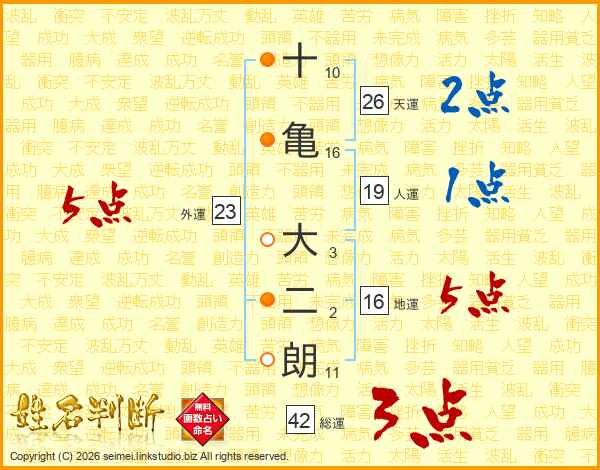 十(10画)亀(16画) 大(3画)二(2画)朗(11画)