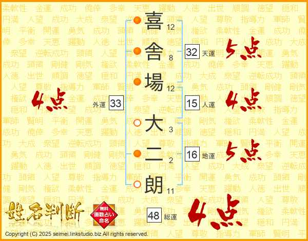 喜(12画)舎(8画)場(12画) 大(3画)二(2画)朗(11画)
