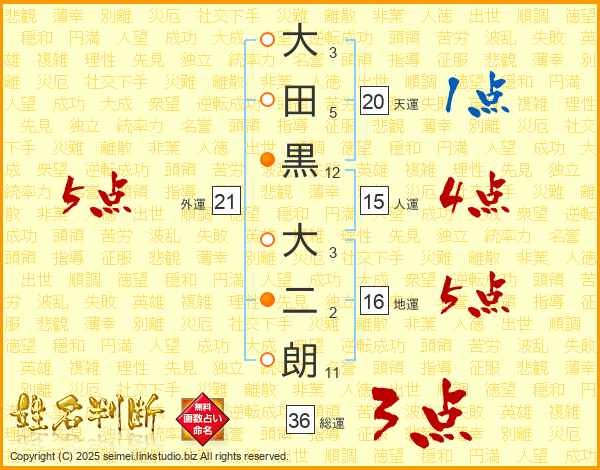 大(3画)田(5画)黒(12画) 大(3画)二(2画)朗(11画)
