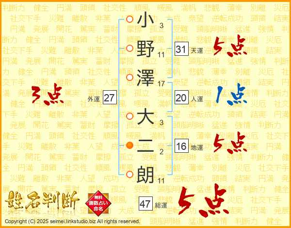 小(3画)野(11画)澤(17画) 大(3画)二(2画)朗(11画)