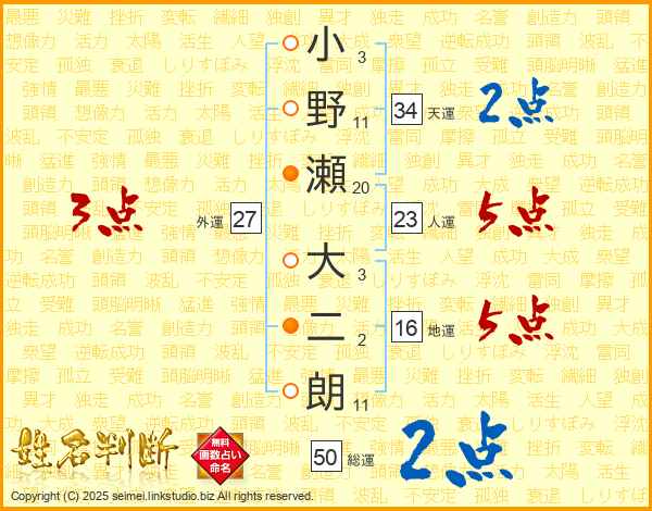小(3画)野(11画)瀬(20画) 大(3画)二(2画)朗(11画)