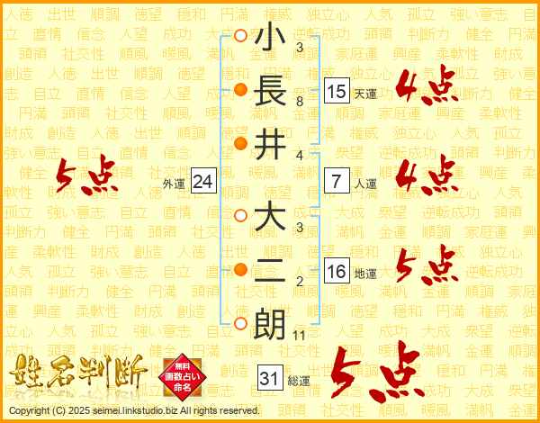 小(3画)長(8画)井(4画) 大(3画)二(2画)朗(11画)