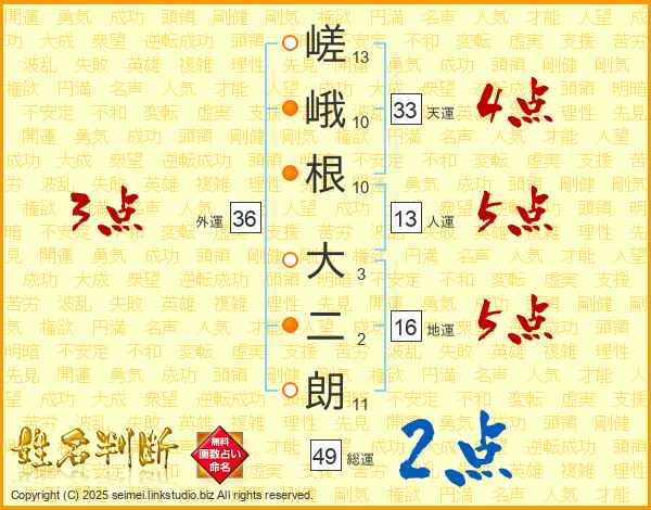 嵯(13画)峨(10画)根(10画) 大(3画)二(2画)朗(11画)
