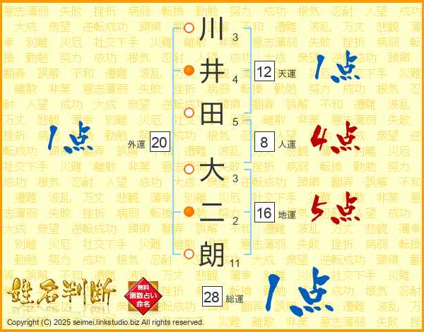 川(3画)井(4画)田(5画) 大(3画)二(2画)朗(11画)