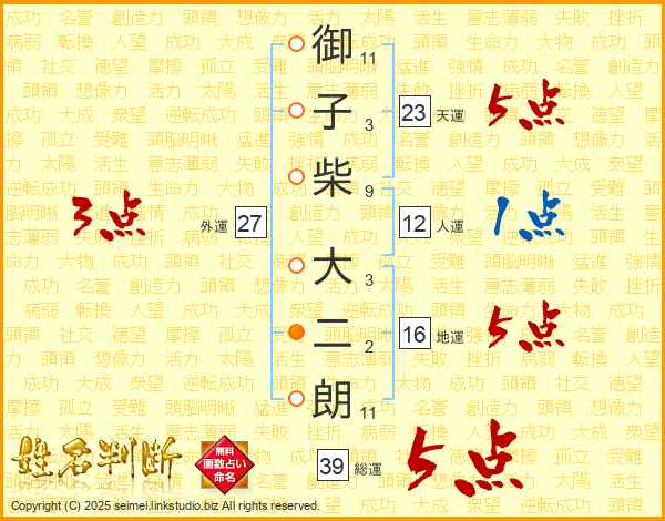 御(11画)子(3画)柴(9画) 大(3画)二(2画)朗(11画)