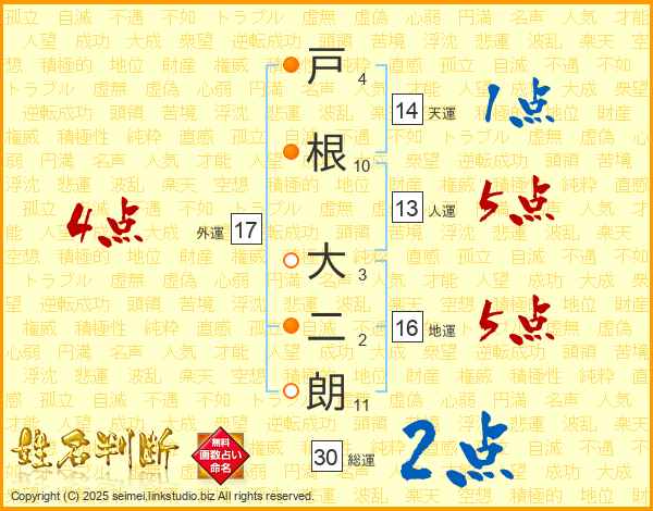 戸(4画)根(10画) 大(3画)二(2画)朗(11画)