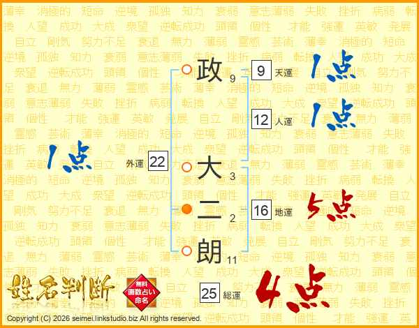 政大二朗さんの地運は16画の5点!