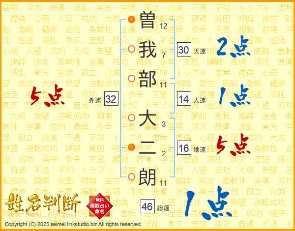曽(12画)我(7画)部(11画) 大(3画)二(2画)朗(11画)