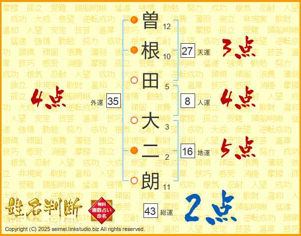 曽(12画)根(10画)田(5画) 大(3画)二(2画)朗(11画)