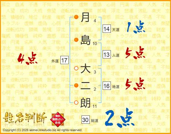 月(4画)島(10画) 大(3画)二(2画)朗(11画)