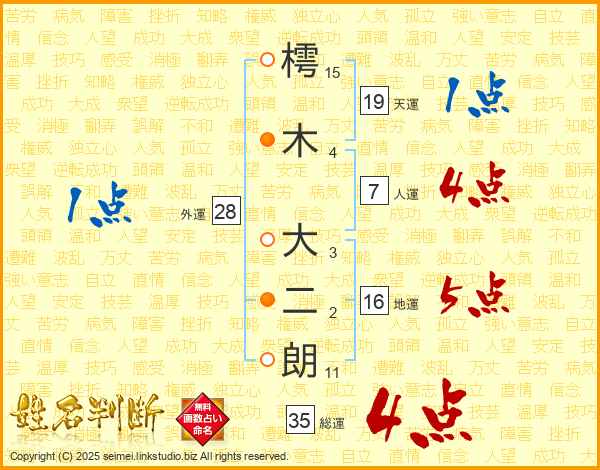 樗(15画)木(4画) 大(3画)二(2画)朗(11画)