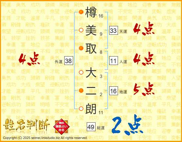 樽(16画)美(9画)取(8画) 大(3画)二(2画)朗(11画)