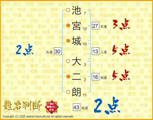 池(7画)宮(10画)城(10画) 大(3画)二(2画)朗(11画)