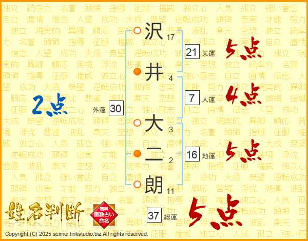沢(17画)井(4画) 大(3画)二(2画)朗(11画)