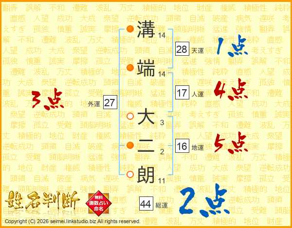 溝(14画)端(14画) 大(3画)二(2画)朗(11画)