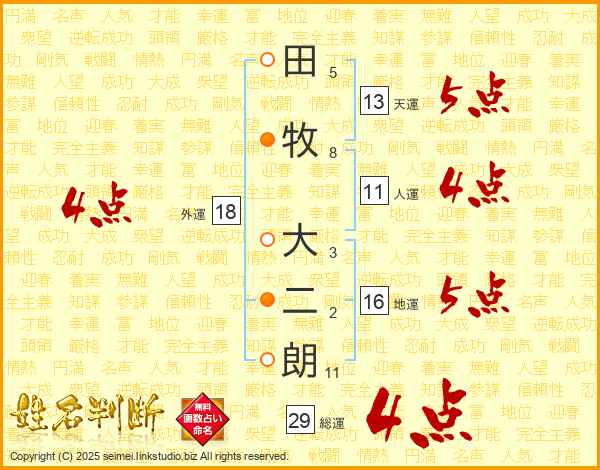 田(5画)牧(8画) 大(3画)二(2画)朗(11画)