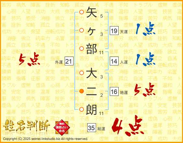 矢(5画)ヶ(3画)部(11画) 大(3画)二(2画)朗(11画)