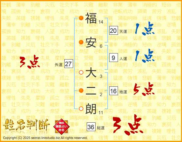 福(14画)安(6画) 大(3画)二(2画)朗(11画)