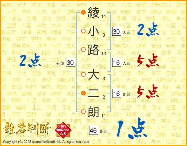 綾(14画)小(3画)路(13画) 大(3画)二(2画)朗(11画)