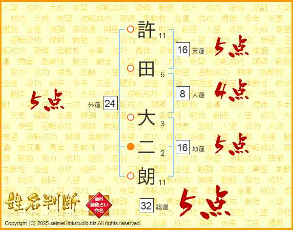 許(11画)田(5画) 大(3画)二(2画)朗(11画)