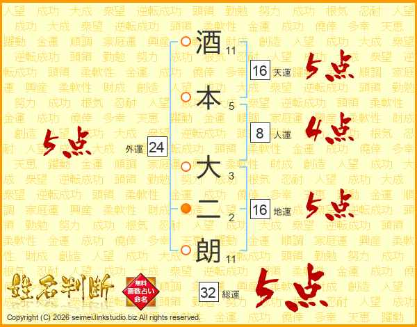酒本大二朗さんの天運は16画の5点!