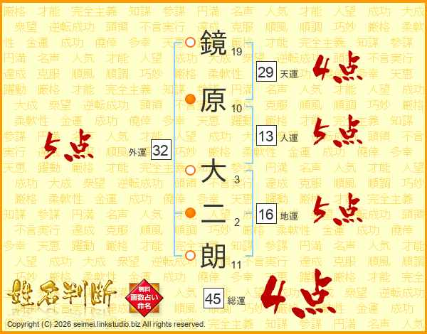 鏡(19画)原(10画) 大(3画)二(2画)朗(11画)