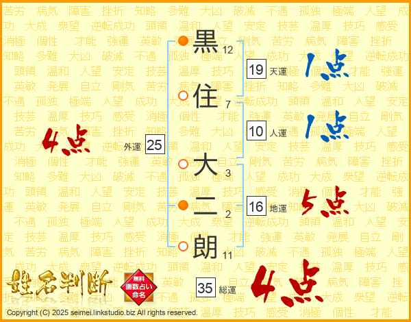 黒(12画)住(7画) 大(3画)二(2画)朗(11画)