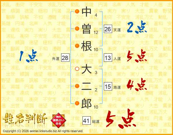 中(4画)曽(12画)根(10画) 大(3画)二(2画)郎(10画)
