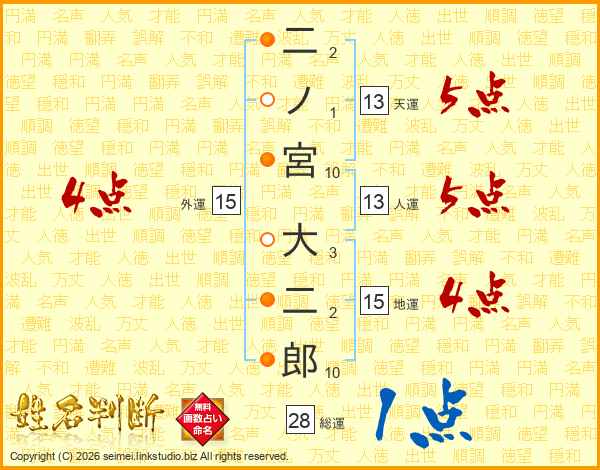 二(2画)ノ(1画)宮(10画) 大(3画)二(2画)郎(10画)