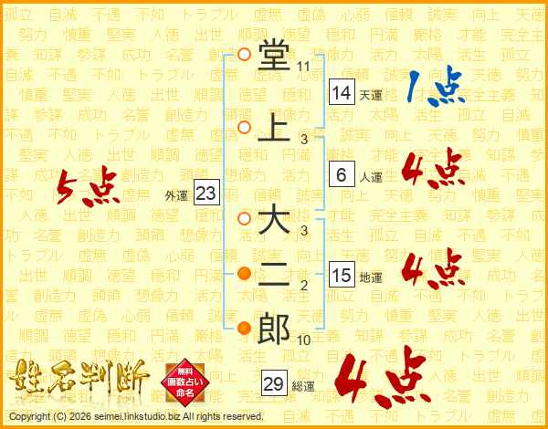 堂(11画)上(3画) 大(3画)二(2画)郎(10画)