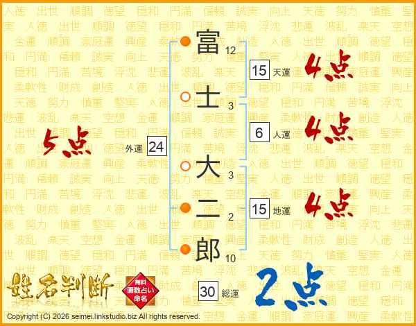 富(12画)士(3画) 大(3画)二(2画)郎(10画)