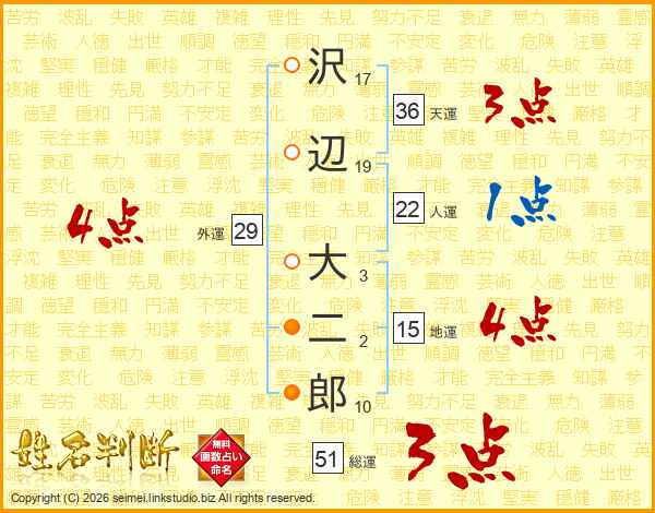 沢(17画)辺(19画) 大(3画)二(2画)郎(10画)
