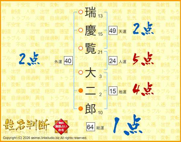 瑞(13画)慶(15画)覧(21画) 大(3画)二(2画)郎(10画)