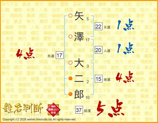 矢(5画)澤(17画) 大(3画)二(2画)郎(10画)