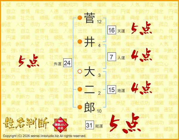 菅(12画)井(4画) 大(3画)二(2画)郎(10画)