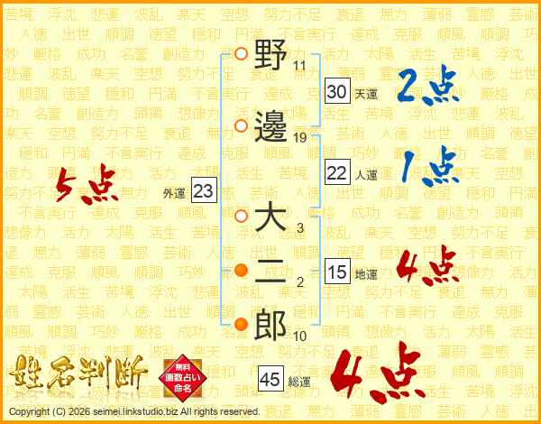 野(11画)邊(19画) 大(3画)二(2画)郎(10画)